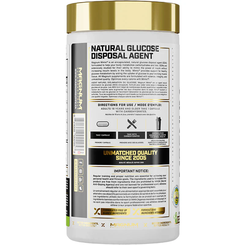 Magnum MIMICĀ® harnesses the power of insulin mimicking to increase oneās insulin sensitivity, without increasing insulin levels in your body. A person who is āinsulin resistantā has a hard time processing carbohydrates, which results in the release of excess insulin to get glucose into the resistant cells. Insulin resistance is a sign of the beginning stages of diabetes and occurs when the body is not able to utilize the insulin correctly. When your body releases excess insulin, carbs are stored as body fat, when they should be used as energy and as glycogen for bigger, fuller muscles. MIMICĀ® was formulated to increase insulin sensitivity for all healthy individuals. So whether youāre trying to build muscle, burn fat, or both, you need every calorie you ingest to be optimized. You want carbohydrates to supply energy and great pumps, and proteins and healthy fats to build muscle and burn fat!