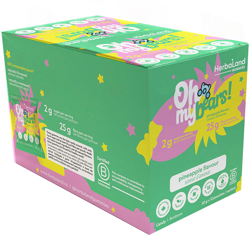 Oh my! These gummies are the best candy around, with only 2g of sugar and 25g of fiber per pouch. Made from plant-based ingredients and all-natural flavours, these gummies are the perfect healthy snack!
